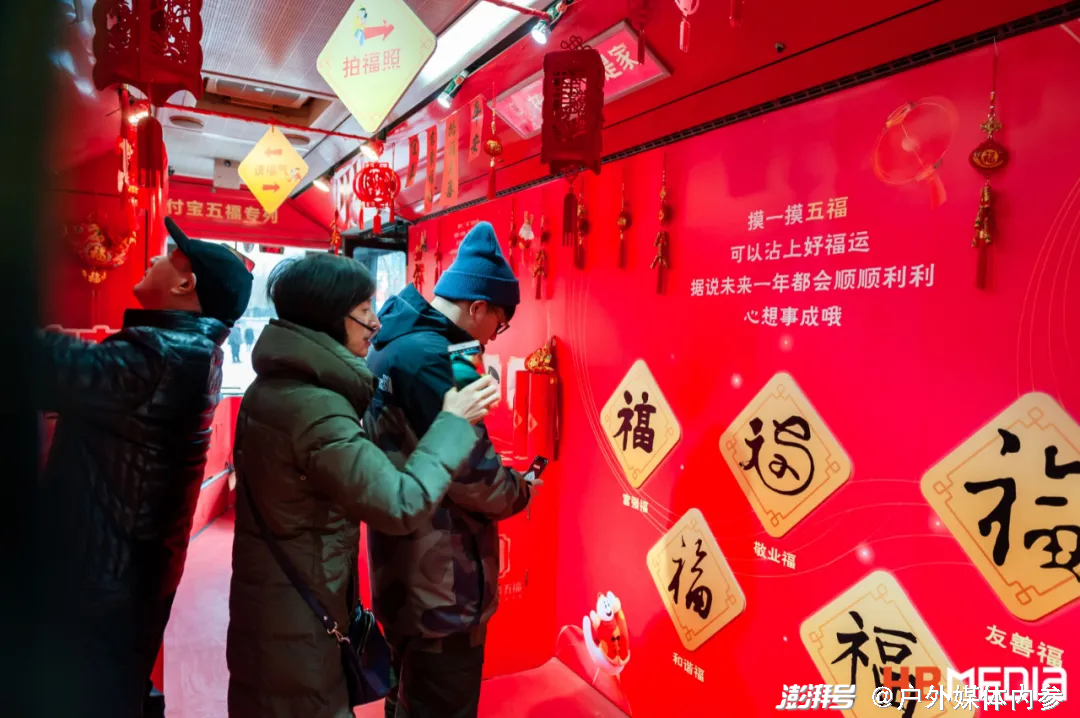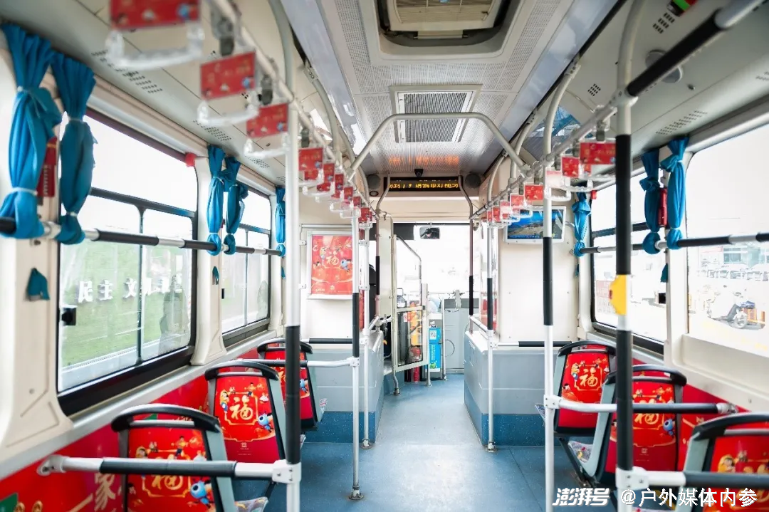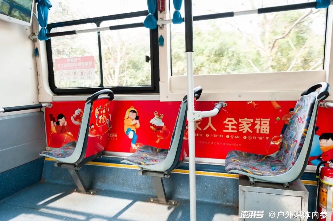 公交車身以中國紅為主色調(diào),亮眼、喜慶、溫馨,充滿了年味;將人物做了部分上窗處理,在保證車輛日常行駛的同時,讓畫面有了靈動和立體感。通過對椅背、拉手、立牌、立面的上畫,和外車身有了強呼應,整體營造出主題專列的氛圍。公交媒體有著天然的大眾傳播屬性,市民在車內(nèi)車尾集五福過程中,會持續(xù)發(fā)生人際流轉(zhuǎn)、情感互動以及二次傳播,也讓集五福更加情感化和生活化。